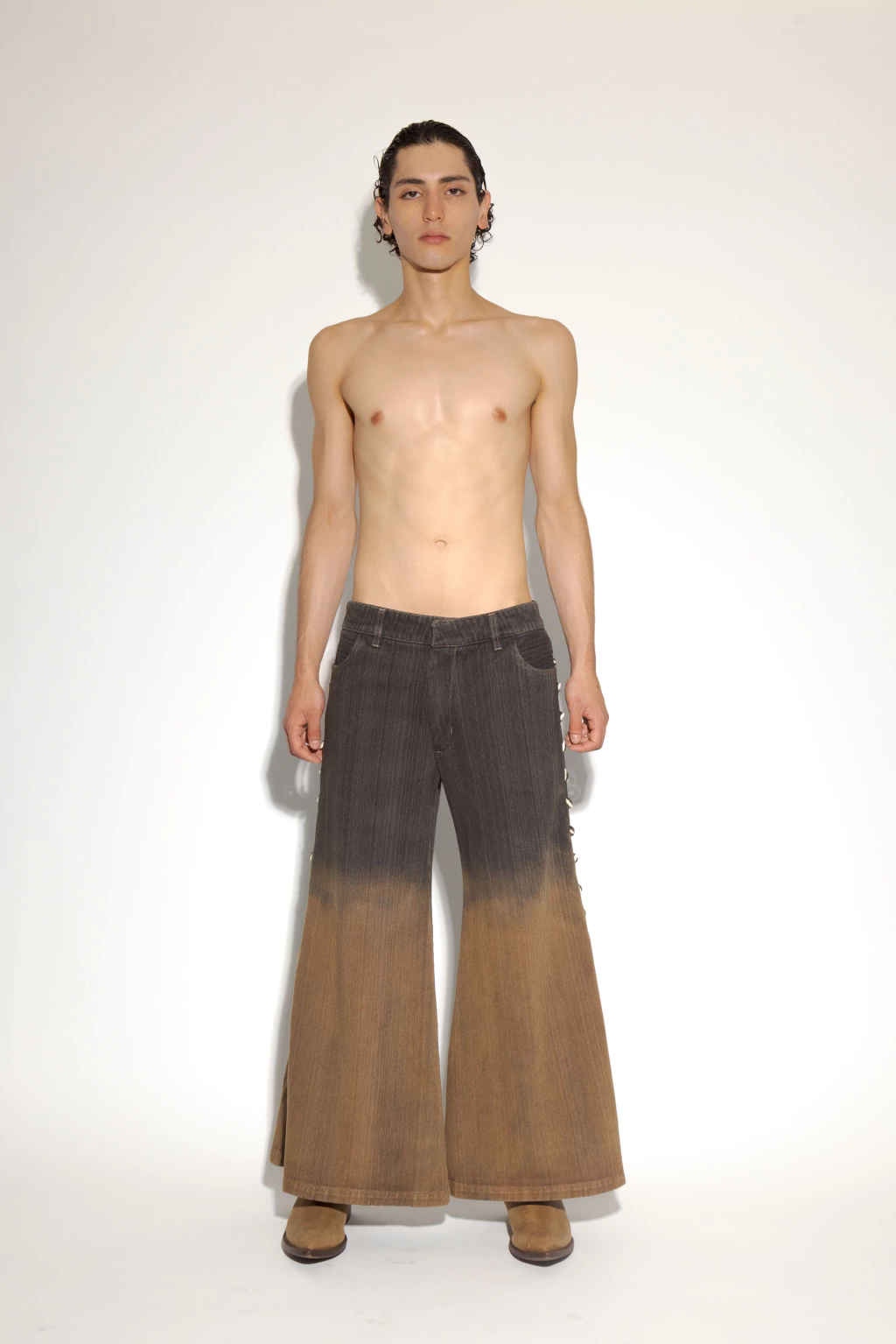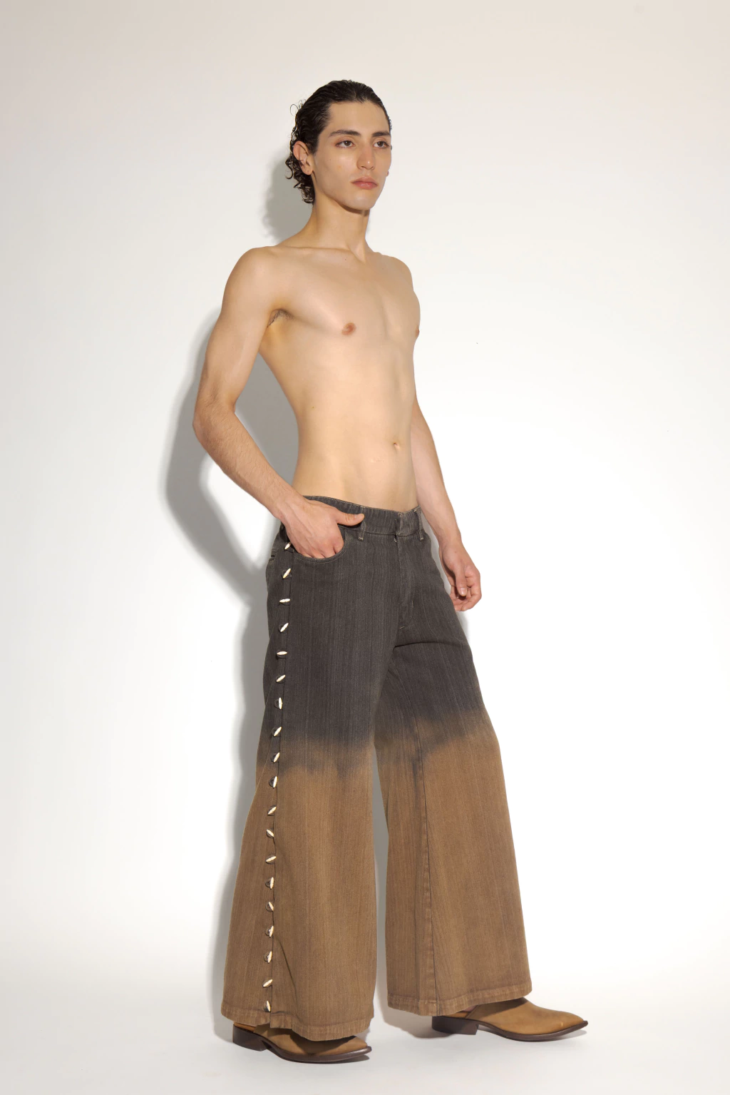 Pantalones de tiro bajo con corte extra acampanado, confeccionados en mezclilla con efecto degradado en tonos camel y negro. Detalles únicos con botones laterales de hueso tallados a mano.