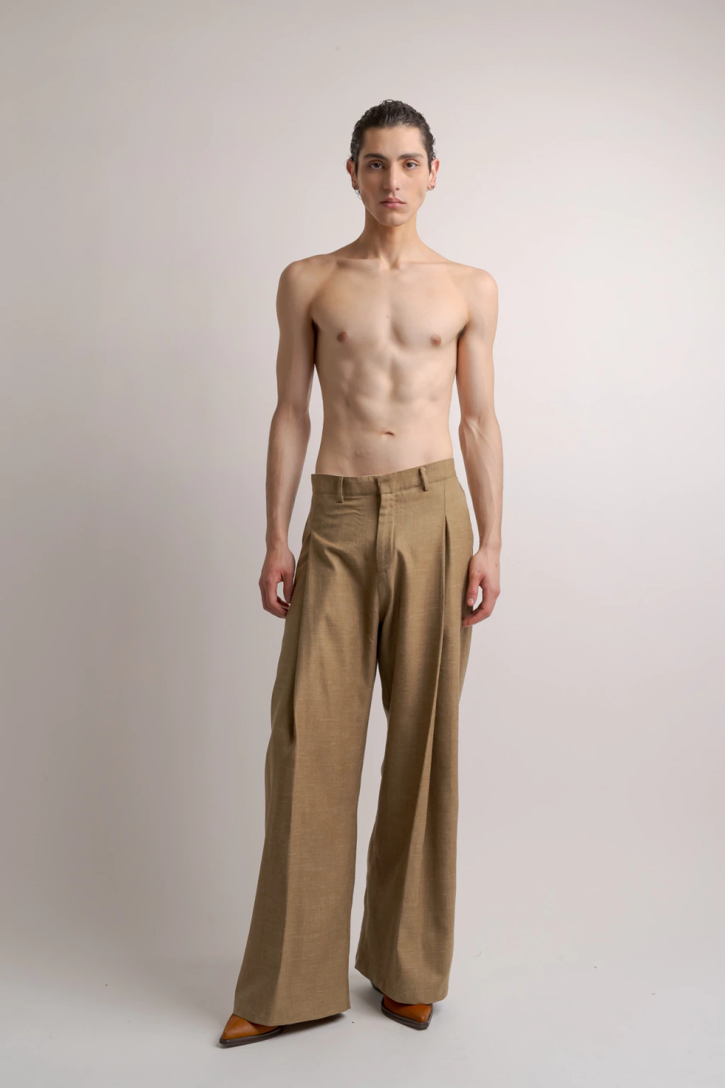 Extra wide pants made from silk and wool twill with a single pleat. Side pockets and welt pockets at the back.
