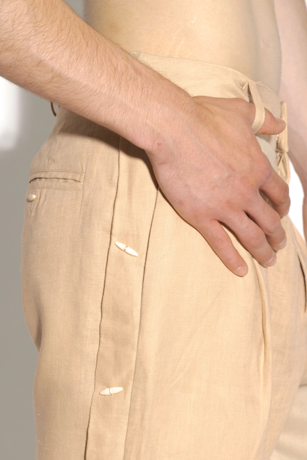 Oversized tailored, wide leg, single pleated pants with side structure and hand carved bone buttons.